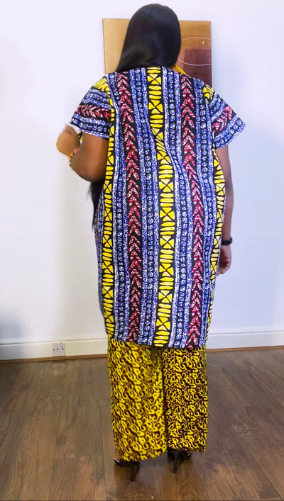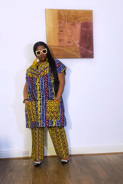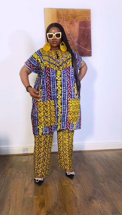 A two piece set made of cotton fabric, with double sided deep pockets. The top is short sleeves and can serve as a dress also, the trouser length if 45.